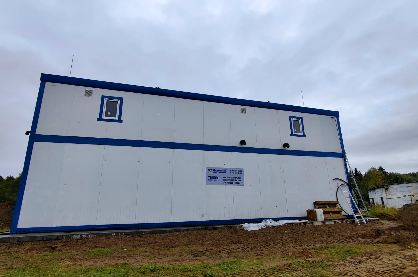 Станция очистки бытовых сточных вод "ТВЕРЬ-50С" представляет из себя утепленное здание из блок-модулей, установленных на фундаменте, со всем технологическим оборудованием внутри.